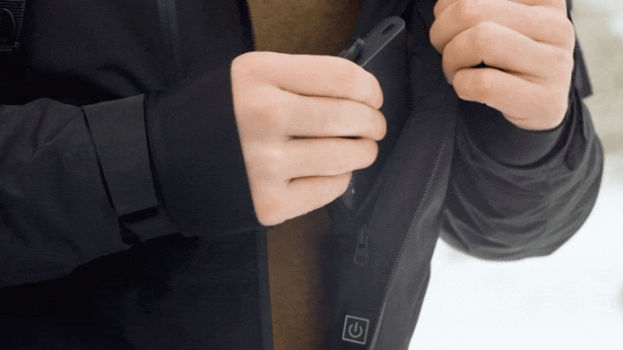 WinterCraft jackets use carbon-fiber heating elements connected to a USB cable inside the jacket. Just plug in any power bank, press the button, and the jacket starts heating within seconds.